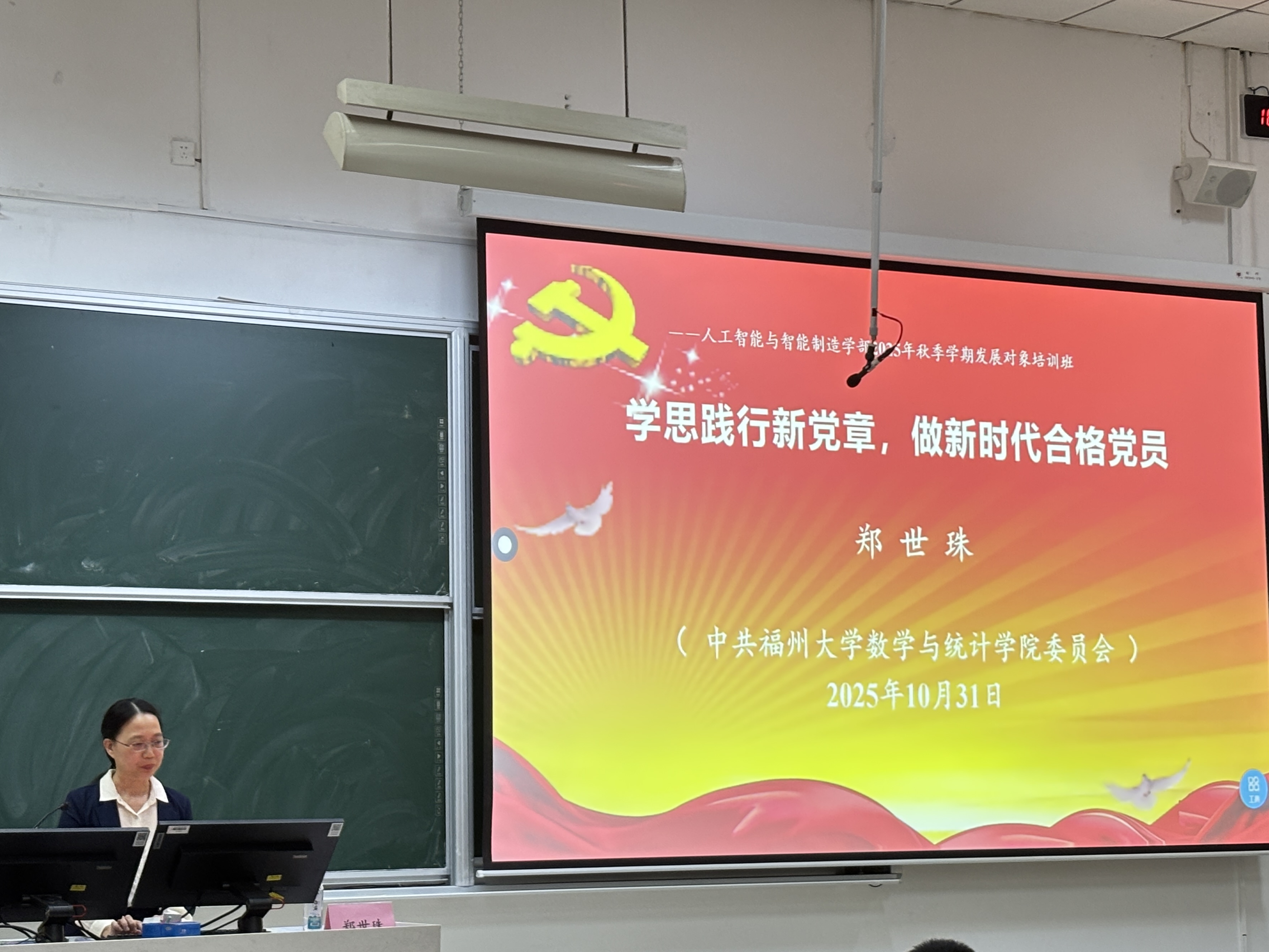党委书记郑世珠在教学楼文四-102教室,以“学思践行新党章,做新时代合格党员”为题,为人工智能与智能制造学部2025年秋季学期发展对象培训班讲授专题党课(思政课)。