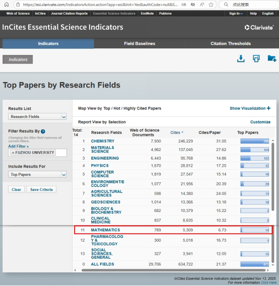 2025年11月13日,据科睿唯安最新发布的《基本科学指标数据库》(Essential Science Indicators,简称ESI)统计数据显示,av直播